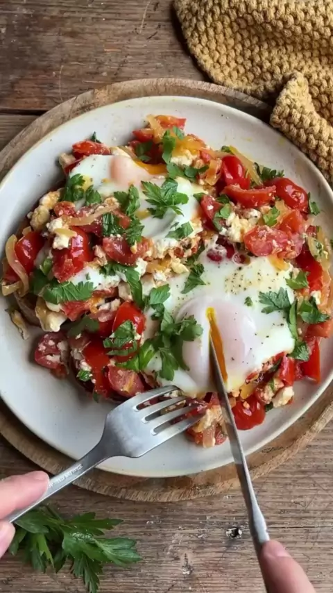 Ingredientes: - 1-2 fatias de pão, torradas - 150 g de tomates - 1/2 cebola - Alho a gosto - 50 g de queijo feta - 2 ovos - Salsa - Pimenta, sal e (chili a gosto) - Azeite de oliva #diabetes #receitas #receitafacil #diabetestipo2 #ovo