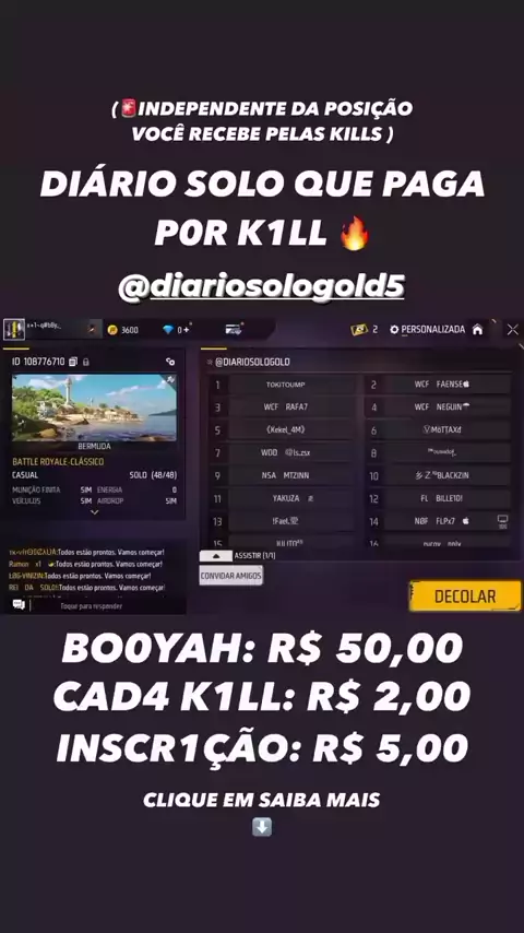 VENHA JOGAR O DIÁRIO COM A MELHOR PREMIAÇÃO DO CENÁRIO SOLO DE FREE FIRE💰 🏆 BOOYAH R$ 50,00 ☠️ CADA KILL R$ 2,00 SE VOCÊ FIZER 5 KILLS JÁ SÃO R$ 10,00 NA SUA CONTA 😱 🚀 INSCRIÇÃO R$ 5,00 LINK PARA CONTATO NA BIO DO INSTAGRAM, VENHA FATURA CONOSCO💸🤑 #freefire #campeonatoff #campeonatofreefire #freefirebrasil
