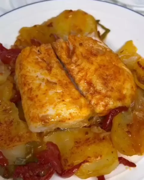 Ingredientes: - 2 lombos de pescada, pele e espinhas removidas - 3 batatas. - 1 pimentão verde - 2 tomates - Páprica doce de La Vera - Azeite virgem extra - Sal Modo de fazer: Asse 180° por 45 minutos os legumes. Retire o prato do forno, coloque a pescada sobre as batatas e os legumes. Tempere e polvilhe com páprica e regue com um fio de azeite. Continue cozinhando no forno a 180°, aqueça para cima e para baixo, 15-20 minutos. O tempo pode variar em função do tamanho da pescada e do forno.