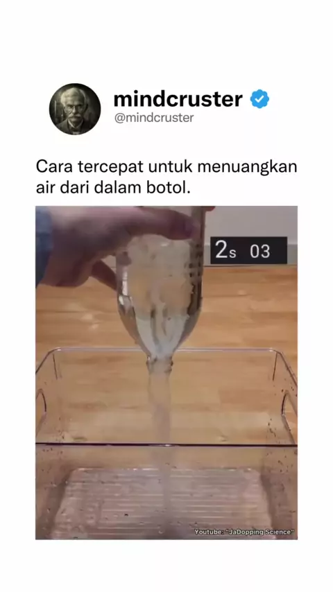 Saat menuang air dari dalam galon / botol, cara paling cepat untuk mengosongkan isinya adalah dengan membuat pusaran air. Mengapa? Karena saat membuat pusaran air dengan memutar botol, kita sebenarnya membuat saluran udara agar udara bisa masuk dan mengisi ruang kosong di dalam botol tanpa mengganggu laju air yang keluar. Credits: JaDropping Science Ikuti @mindcruster untuk konten menarik tiap harinya! #water #physics #science # #reels #reelsvideo #instareels #explor...