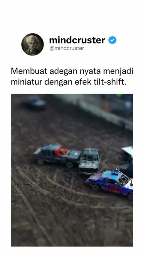 Tilt-shift adalah teknik fotografi yang membuat objek nyata terlihat seperti model miniatur atau mainan. πŸ“Έ Bisa menggunakan lensa tilt-shift pada kamera, atau melalui editing tambahan pada rekaman yang sudah ada. 🧠 Ketika kita melihat benda kecil dari dekat, seperti mobil mainan, kita biasanya melihat mobil itu dengan jelas namun sekelilingnya terlihat buram, inilah ilusi yang ditiru pada teknik tilt-shift. Credits: SufficientSecret7164 / Reddit Ikuti @mindcruster untuk konten menarik ...