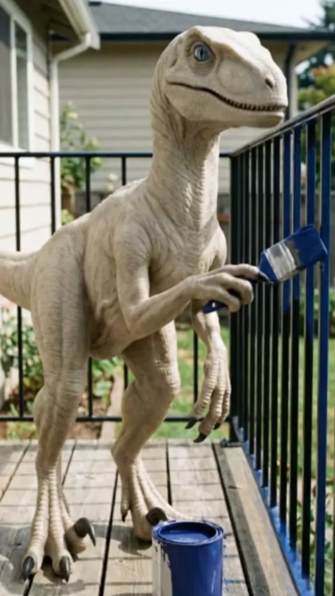 Hoje não teve corrida, teve muito trabalho aqui em casa. 🦖🖌️ Já pintei as grades e agora estou em cima do telhado. Será que eu levo jeito para pintor profissional? 😂🏠 Assista até o final pra ver meu esforço e já deixa aquele coraçãozinho! ❤️ #KwaiBrasil #Dinossauro #VidaDeDino #Pintura #Reforma