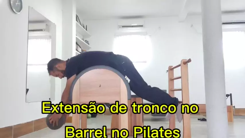 Esse exercício de extensão de tronco no Barrel, no Pilates, fortalece toda a musculatura das costas, melhora e corrige a postura, e ajuda a aliviar dores em coluna.