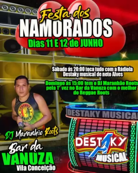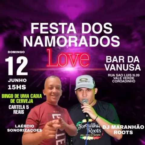 É NESTE DOMINGO I DIA 12 DE JUNHO FESTA  DOS NAMORADOS NO *BAR DA VANUSA  RUA SAO LUIS 9 VALE VERDE* E PARA COMANDAR A FESTA TEM PELA PRIMEIRA VEZ O *DJ MARANHÃO ROOTS* E * LAÉRCIO SONORIZAÇÃO* VAI SER DEMAIS O *BAR DA VANUSA FICA LOCALIZADO NA RUA SAO LUIS 9 VALE VERDE NO COROADINHO* EU TE VEJO LA!