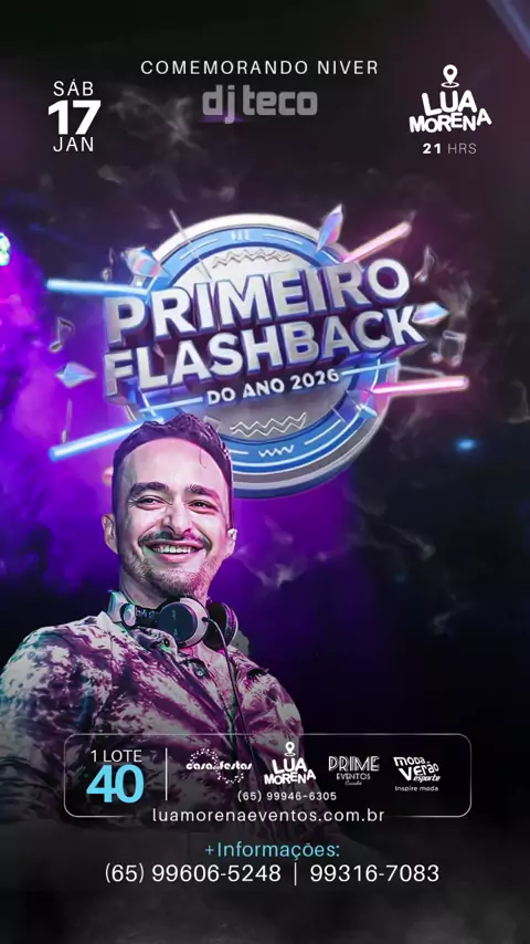 >VENDAS LIBERADAS< "O PRIMEIRO FLASH BACK DO ANO" Sábado 17 Janeiro 2026 Na Lua Morena, Apartir 21hr Venha Comemorar o Aniversário do DJ TECO!!! >>INGRESSOS 1º LOTE 40,00<< www.luamorenaeventos.com.br Pontos de Vendas: - CASA DE FESTAS - MODA VERÃO SPORT (Centro) - LUA MORENA - PRIME EVENTOS Informações, Ingressos, Mesas, Bistrôs e Camarotes 65 99606 5248 65 99316 7083