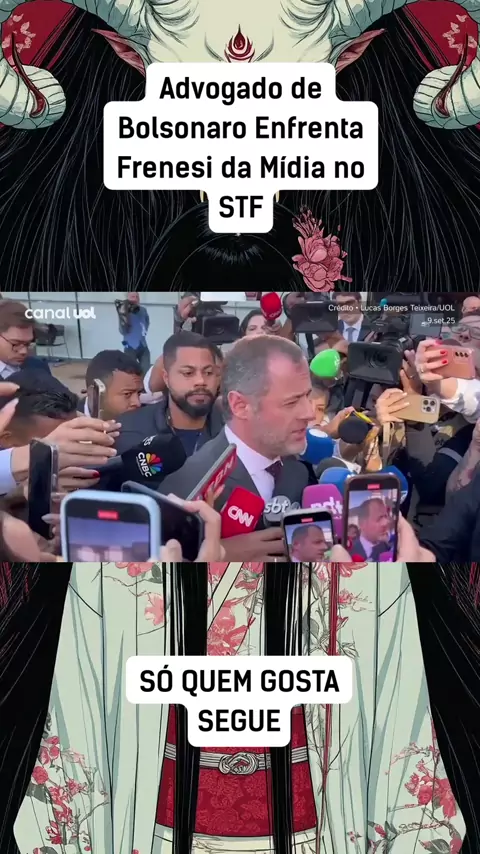 Paulo Cunha Bueno, um dos advogados de Jair Bolsonaro, chega ao STF e é imediatamente cercado por repórteres ansiosos por respostas. O advogado esclarece que o ex-presidente não comparecerá ao julgamento pessoalmente esta semana devido a recomendações médicas. - #Bolsonaro #STF #Advogado #Mídia #Julgamento