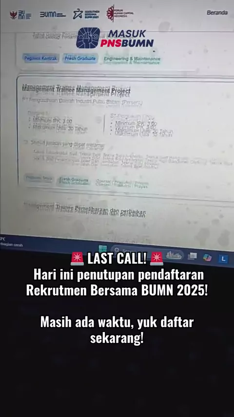 🚨 LAST CALL! 🚨 Hari ini penutupan pendaftaran Rekrutmen Bersama BUMN 2025! Masih ada waktu, yuk daftar sekarang!#bumn#pertamina#tesbumn#rbb#rbbbumn#fhcibumn#bumn#kementerianbumn#pos#posindonesia#jasamarga#mindid#inka
