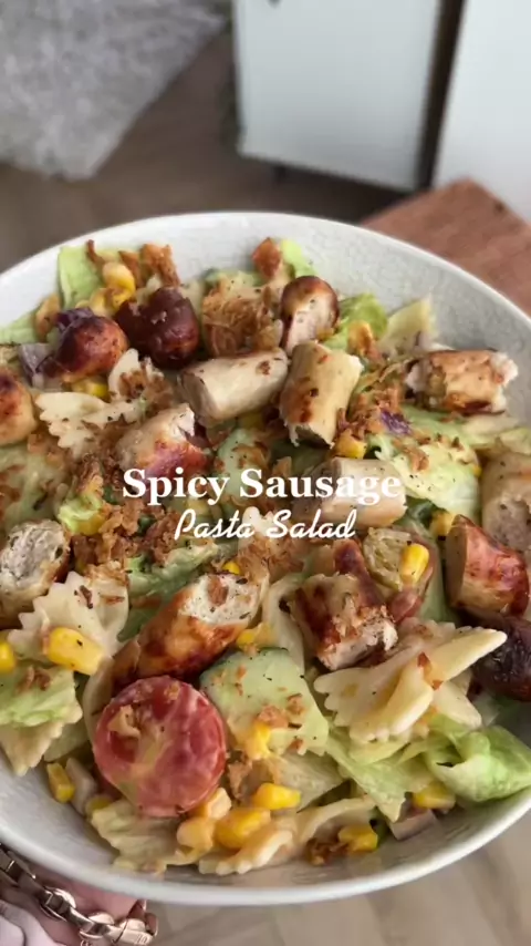 Salsicha picante e salada de macarrão! Esta é a ideia perfeita do almoço de trabalho # hollybdishes # worklunch # pastasalad # healthyworklunchidea # healthymeal # chickensalsage