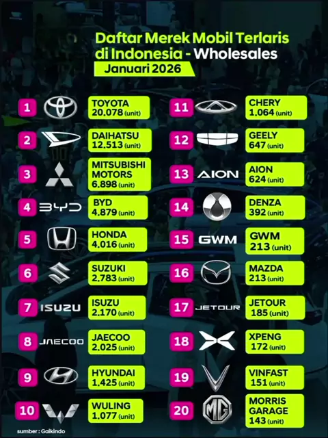 πŸš—πŸ”₯ MASIH KUAT DI PUNCAK! πŸ”₯πŸš— Alhamdulillah, kepercayaan masyarakat Indonesia terhadap Toyota nggak pernah pudar! Berdasarkan data Gaikindo per Januari 2026, Toyota kembali merajai wholesales nasional dengan distribusi 20.078 unit! πŸ† Angka ini membuktikan kalau Toyota selalu jadi pilihan utama untuk menemani perjalanan dan aktivitas keluarga di Indonesia. Buat kamu yang mau jadi bagian dari jutaan pengguna Toyota, sekarang saatnya yang tepat! Mulai tahun 2026 dengan mobil baru impianmu. ✨