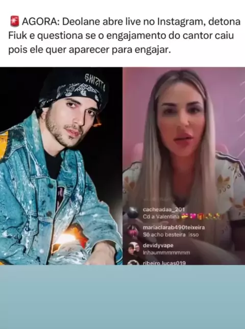 🚨AGORA: Deolane abre live no Instagram, detona Fiuk e questiona se o engajamento do cantor caiu pois ele quer aparecer para engajar. O que vocês acham? Instagram siga: @viva_nossavoz para ver mais! #Deolane #viral #foryou #brasil #fy