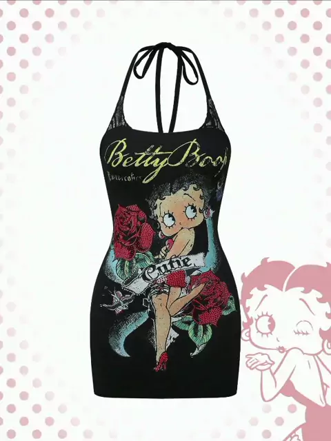 Betty Boop | ROMWE Vestido Curto Bodycon com Decote Halter, Figura de Desenho Animado Retrô Sexy, Contraste de Renda e Strass, Estilo Y2K Descobri produtos incríveis no SHEIN.com, venha conferir! https://api-shein.shein.com/h5/sharejump/appjump?link=lo3XvaSa8Pa_8&localcountry=BR&url_from=GM75313487495