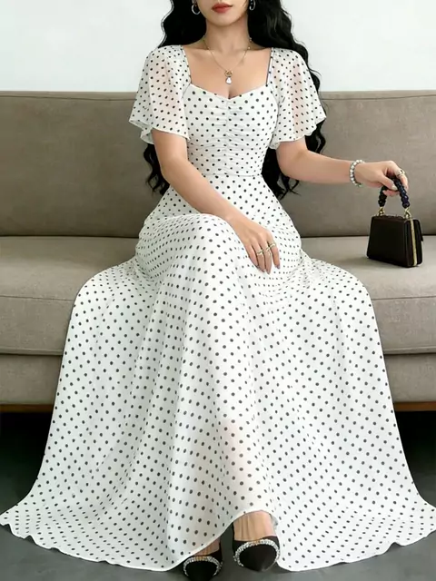 Modelyn Vestido Longo Minimalista Feminino com Estampa de Bolinhas, Decote Quadrado e Manga Curta, Vestido Longo Elegante com Cintura Marcada, Adequado para Férias de Verão e Uso Diário Descobri produtos incríveis no SHEIN.com, venha conferir! https://api-shein.shein.com/h5/sharejump/appjump?link=lKdfNq4veHg_8&localcountry=BR&shc=2_lKdfNq4veHg&url_from=GM75313487495