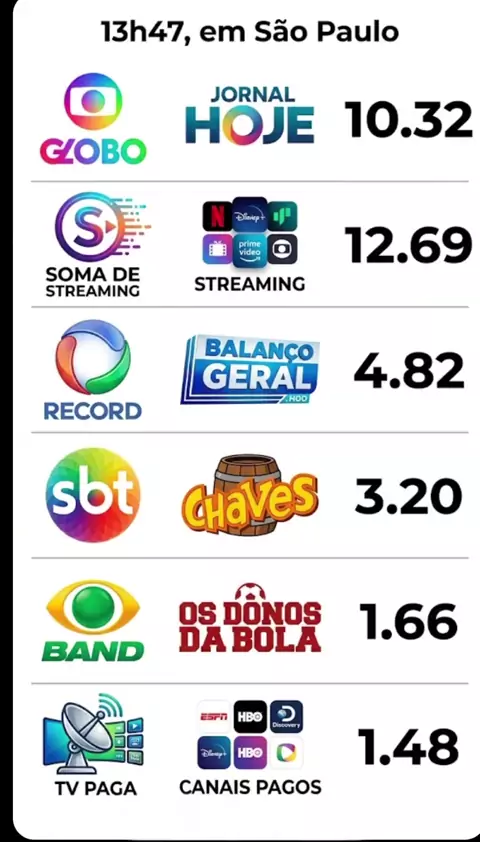 Soma dos Streamings acima de 14 pontos, Globo liderando com Jornal Nacional #globo #sbt #audiencia #recordtv #novela