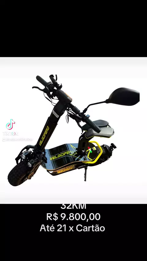 A imagem mostra um *Veículo Elétrico (E-Bike/E-Scooter)* da marca *Velocifero*, modelo *MAD*, com design preto e amarelo e detalhes da bandeira italiana. 800 W até 32 KM h autonomía 40 a 50 Km R$ 9.800,00
