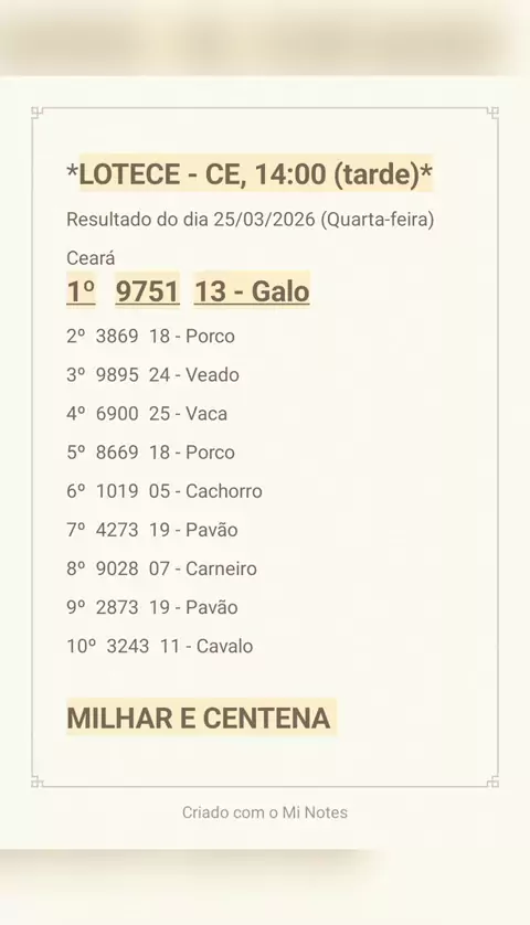 Milhar no 1° prêmio, na Lotece Ceará.