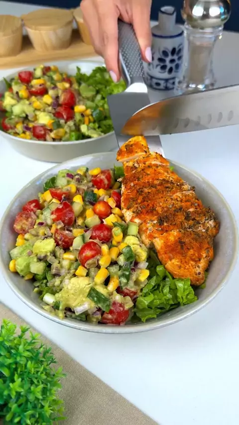 SALADA COM FILÉ DE FRANGO 😍 Essa salada é perfeita e vai salvar a sua dieta 🍽️ Ingredientes: • 2 filés de frango • 1 tomate • 1 lata de milho • 1/2 pepino • 1 cebola roxa • Cebolinha a gosto • Alface crespa • 1 avocado 🍽️ Ingredientes do Molho: •2 dentes de alho • 2 colheres de sopa de coentro • 6 colheres de sopa azeite • Suco de 2 limões • 2 colheres de chá de mel • Sal a gosto • Pimenta-do-reino a gosto Assar os filés de frango na airfryer por 10 min a 200º . . ● 📽@camilafigfit