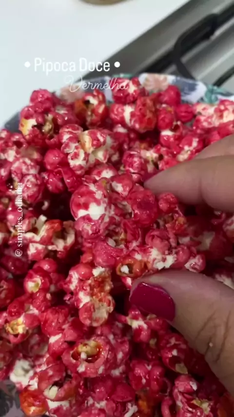 🍿 Pipoca Doce Vermelha ♥️ Gente vim mostrar pra vocês como eu faço a pipoca vermelha, que algumas pessoas me pediram. Você pode usar a cor que preferir . Eu utilizei a tradicional vermelhinha. 👉🏼 Ingredientes: • meia xícara de açúcar • meia xícara de milho para pipoca • meia xícara de água • 4 colheres sopa de óleo •• Corante alimentício na cor vermelho ( bem pouco) 👉🏼 coloca tudo na panela, mistura bem e liga o fogo. Prim • 📽 @confeitaria_receitas_dicas
