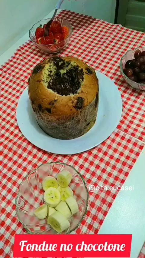 Fondue no chocotone ingredientes: 1caixa de creme de leite 1 barra e meia de chocolate meio amargo 1 chocotone frutas para acompanhar! #viral #receitas #chocotone #receitasfaceis #receitasnatalinas