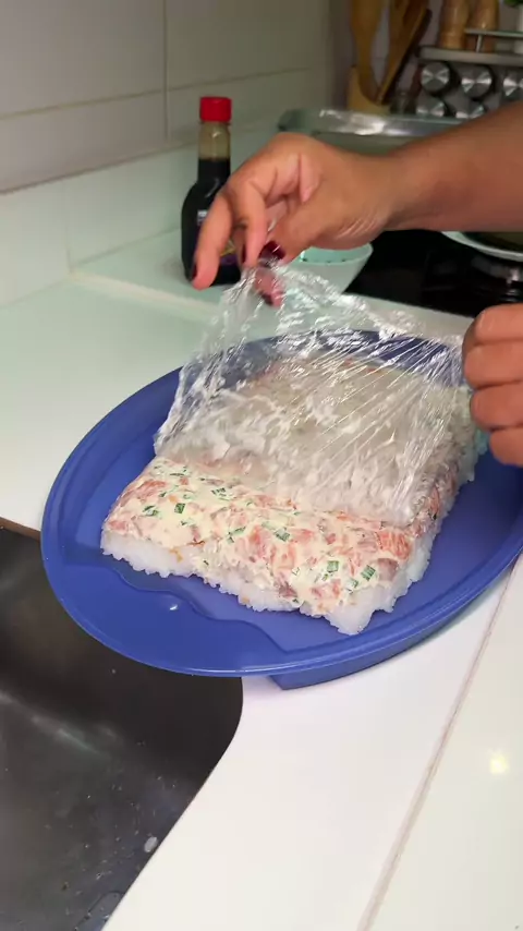 Sushi de Priguiçoso Ingredientes: -500g de salmão -2 colheres (sopa) bem cheia de  cream cheese -Cebolinha,  gergelim  e molho taré  a gosto. -Algas pra servir Arroz japonês -2 xícaras (chá)de arroz -2 ½ xícaras (chá) de água -4 colheres (sopa) de vinagre de arroz -2 colheres  rasas (sopa) de açúcar -1 colher (chá) de sal Lave o arroz até liberar bastante amido, leve ao fogo por mais ou menos 25 minutos. Pra temperar o arroz, faça  a mistura com o açúcar,  sal e o vingre e despeje