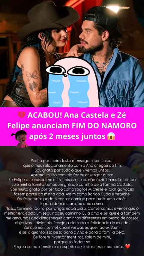 💔 ACABOU! Ana Castela e Zé Felipe anunciam fim após 2 meses. Foi amigável, só gratidão 🥺 Shippava? Comenta e dueta! 👇🔥 #AnaCastela #ZeFelipe #FimDoNamoro #Sertanejo #Celebridades