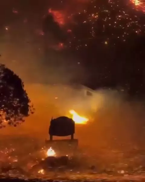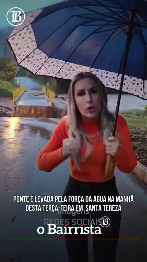 A ponte foi arrastada pelas enchentes durante a gravação de discurso da prefeita da cidade de Santa Teresa RS (Brasil, 30 de abril de 2024).