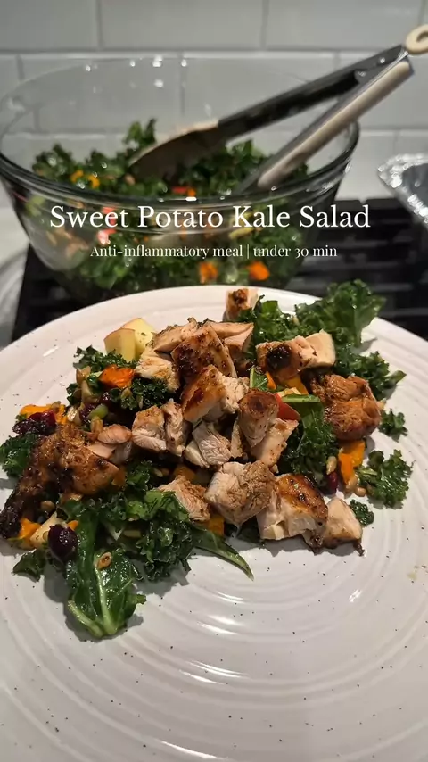 Salada de couve com batata-doce 🥗✨ Saudável, nutritiva e muito saborosa! Couve massageada, batata-doce assada e um molho cremoso de manteiga de amêndoas. Eu finalizei com frango grelhado 😋 💚 Quer mais receitas fit? 👉 Link no primeiro comentário fixado no Google! #receitafit #alimentacaosaudavel #emagrecimento #bowlfit #fitness