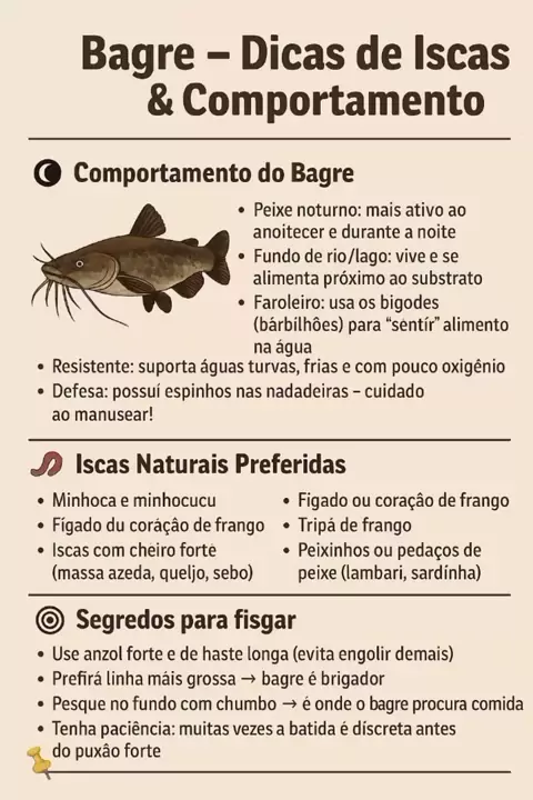 🐟 O bagre é um peixe noturno, brigador e sempre atento ao fundo do rio. 👉 Com iscas de cheiro forte e a técnica certa, suas chances de fisgada aumentam muito! Salve esse card e use na sua próxima pescaria." #PescaDeBagre #SegredosDePesca #PescaEsportiva #DicasDePescador #MundoDaPesca