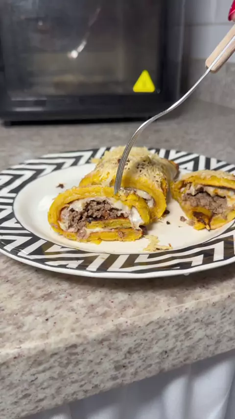 🍌 Rocambole de banana da terra com queijo e carne na air fryer – saudável, crocante e super fácil! 🔥 #receitafácil #bananaDaTerra #airfryer #rocambole