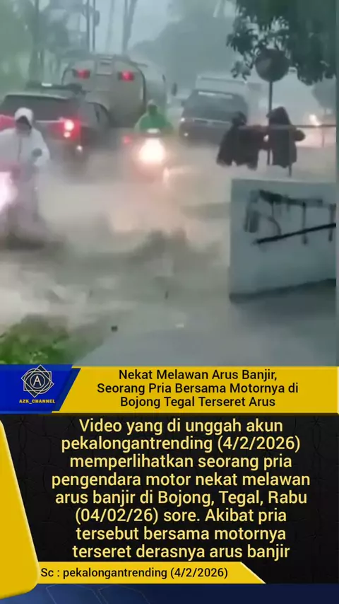 Nekat Melawan Arus Banjir, Seorang Pria Bersama Motornya di Bojong Tegal Terseret Arus. #nekat #melawan #arus #banjir #pria