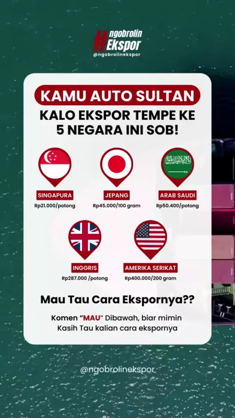Auto Sultan Kalo Kamu Ekspor Tempe Ke 5 Negara Ini Sob!! Follow @ngobrolinekspor #ekspor #eksportempe #tempe #eksporindonesia #belajarekspor #peluangekspor #tipsekspor #eksportirpe