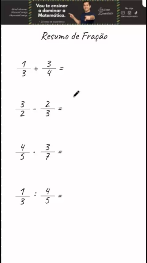 Soma, Subtração, Multiplicação e Divisão em 1 imagem! Vou te ensinar a diferenciar as regras de frações de um jeito que vai colar na sua mente... Você sempre confunde quando tem que multiplicar cruzado ou direto? É normal, as regras são parecidas e confundem mesmo. Já me segue e curte aí, pois esse resumo vale ouro para seus estudos. Transformo questões complicadas em soluções fáceis e rápidas! Neste resumo visual, desvendamos o padrão de cada operação. Veja que na Soma e Subtração, usamos o