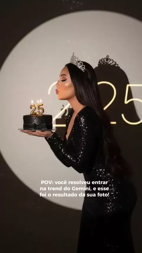 #GEMINNI #GEMINI Crie retratos glamouroso para uma sessão de fotos de aniversário com flash. O fundo é uma parede neutra e simples iluminada por um holofote redondo, projetando uma sombra nítida e dramática atrás de mim, para um efeito cinematográfico. Estou de perfil, inclinada ligeiramente para a frente, como se estivesse soprando vela de um bolo preto com laços que seguro delicadamente com as duas mãos. O bolo está coberto de velas acesas de número 25 e há número 25 a parede.