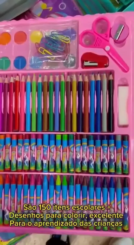 Estojo maleta escolar 150 pçs c/ canetinha e lápis infantil. Link do produto nos comentários. #materialescolar #maletaestojo