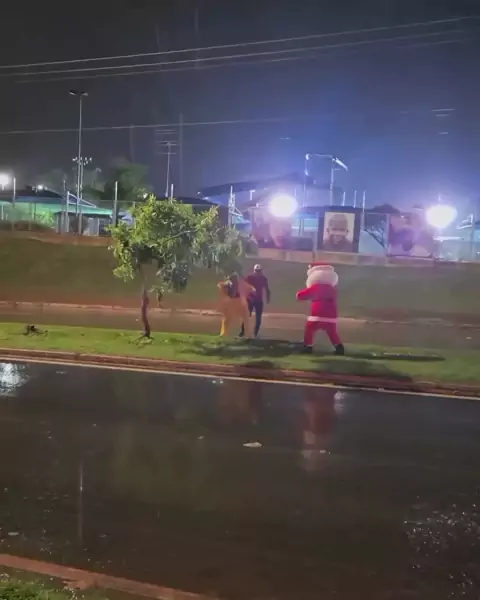 #Repost @euamogurupi_ #Repost @euamogurupi_ Uma cena inusitada chamou a atenção de moradores e repercutiu nas redes sociais na noite desta sexta-feira (19), no setor Aureny III, na região sul de Palmas. Dois homens, um vestido de Papai Noel e outro caracterizado como o personagem Máskara, foram flagrados em luta corporal em plena via pública. O caso aconteceu no canteiro central da Avenida Tocantins, próximo ao Sesc, durante a chuva que caía na cidade no momento do ocorrido. A confusão foi regi