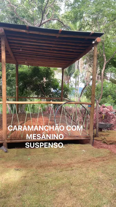 Caramanchão com eucalipto tratado e mesânino suspenso.