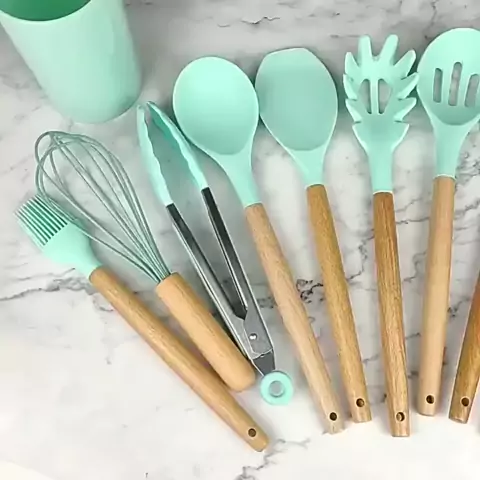 Jogo de Cozinha Kit com 12 Peças de Silicone, Utensílios e Copo Suporte para Cozinha Cabo de Madeira #utensílios #silicone #achadinhosshoppe #achadinhos #SHOPPE