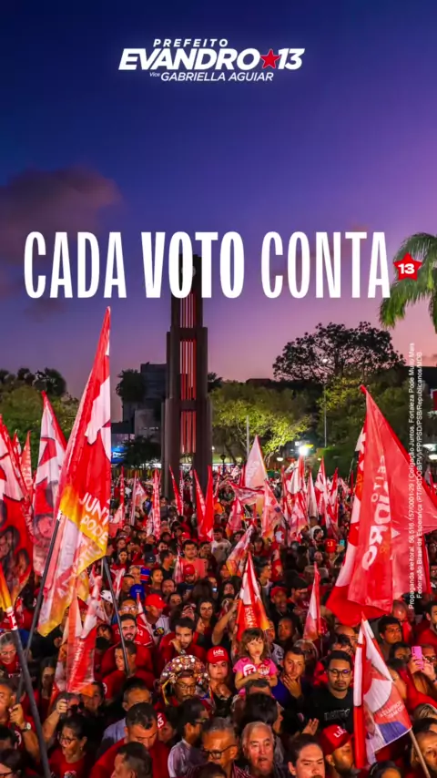 Sabe quem tá fazendo a campanha mais bonita do Brasil? Você! Você que é da militância do 13, que acredita numa cidade melhor e que quer defender Fortaleza do bolsonarismo. Nesta reta final, vamos com ânimo redobrado para conquistar mais votos. Pegue sua bandeira, fale com os amigos, com os indecisos, com os vizinhos. Agora cada voto conta! Domingo, dia 27, é Evandro Prefeito. Vote 13! #JuntosFortalezaPodeMuitoMais #EvandroPrefeito13 #Vote13