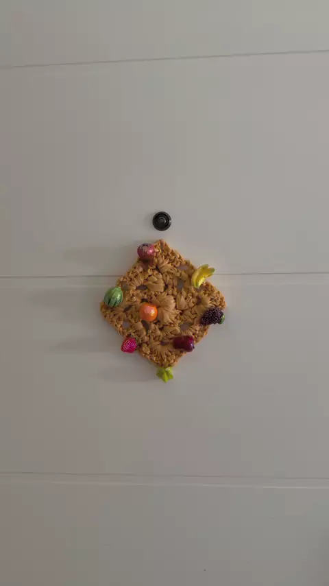 Eu queria um enfeite para a minha porta, para representar abundância! Usei um fio na cor de trigo 🌾 , um quadradão da vovó 👵🏼 e bordei frutas! 🍎🍊🍓