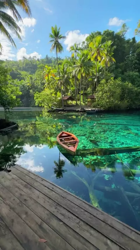 Uma manhã ensolarada no lindo lago claro na Indonésia Lago Paisupok, Banggai Kepulauan Regency, IndonésiaVocê já esteve lá???🥰😍😱 #love #amor #Paisagem #kwai #viagem