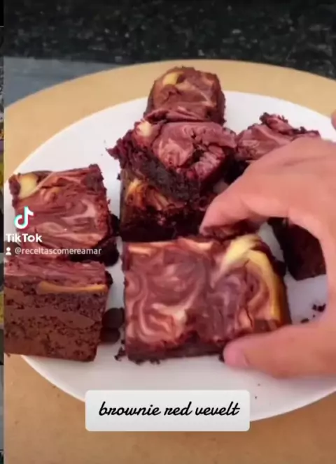 Brownie Red Velvet CheeseCake Ingredientes: 2 ovos 1 xícara e 1/2 de açúcar 1/2 xícara de óleo 1 xícara de farinha de trigo 1/2 xícara de cacau em pó 2/3 xícara de gota de chocolate 115g de cream cheese #brownie #browniefatia #browniechocolate #brownievelvet #brownie