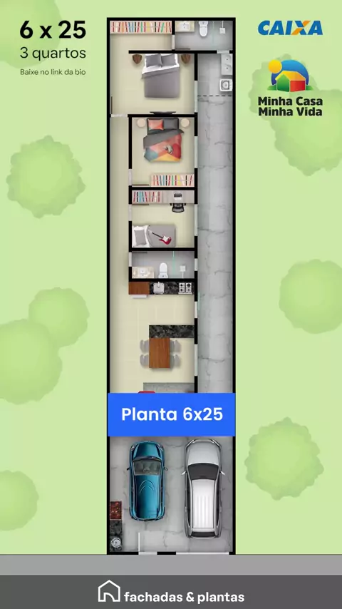 Projeto de casa moderna para terreno 6x25 🏡 Um projeto pensado pra quem busca conforto e funcionalidade! 😍 ✅ 3 quartos bem planejados ✅ Garagem ampla para dois carros ✅ Ambientes integrados e bem distribuídos ✅ Ideal para terreno 6x25 💡 Uma casa completa, com espaço de sobra e aproveitamento inteligente do terreno! Baixe o projeto completo com medidas no site e comece a construir 🔨 #fachada #fachadas #fachadamoderna #plantasdecasa #casas