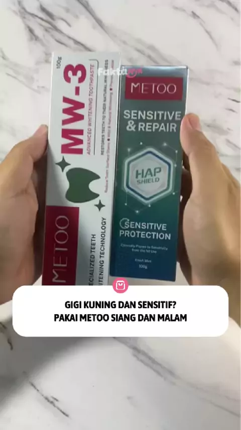 Gigi sensitif dan kuning bikin nggak pede? 🦷✨ Gunakan kombinasi METOO HAP dan MW3! MW3 untuk memutihkan gigi dan bebas karang di siang hari, serta HAP untuk memperbaiki enamel dan merawat gigi sensitif di malam hari. Formula probiotiknya beneran bantu menjaga kesehatan mulut secara maksimal. Yuk, mulai rawat senyummu sekarang! 🛒💖 #MetooToothpaste #PemutihGigi #GigiSensitif #PastaGigiProbiotik #SenyumCerah #MetooIndonesia