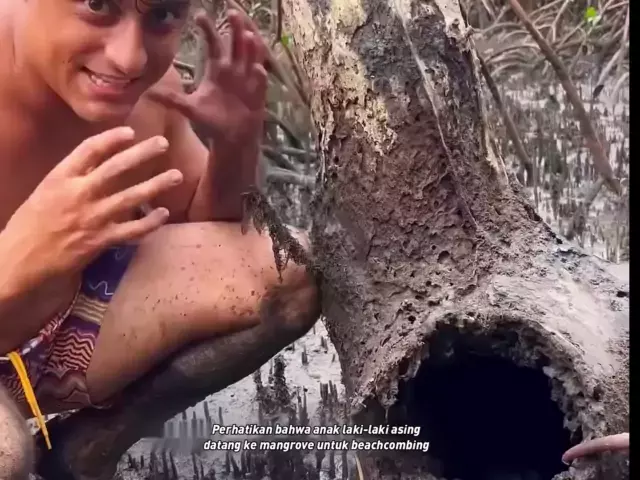 Outdoor beachcombing: Nelayan mencari kepiting hijau raksasa di pantai setelah air surut. # Outdoor unarmed lazy # Happy Fishing