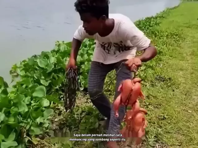 Memancing di luar ruangan: Anak itu menggunakan ayam utuh sebagai umpan hanya untuk menangkap ikan lele hitam besar