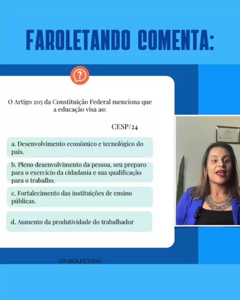 Você sabia que o artigo 205 da Constituição Federal é o queridinho das bancas em concursos na área da educação? 🌟 Após analisar as principais provas, descobri que em 98% delas esse artigo aparece. Teste seus conhecimentos e prepare-se com quem entende do assunto! 🚀 Siga a página para mais dicas e questões essenciais para sua aprovação. Vamos juntos rumo ao sucesso! 💪 #ConcursoPúblico #Estudo #Legislação #Educação #Faroletando