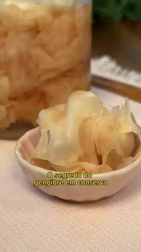Gengibre em conserva de restaurante. Este é o chamado “gari”, gengibre em conserva usado nos restaurantes de sushi para limpar o paladar entre uma peça e outra. Aqui eu ensino duas versões, uma mais forte e rosada e outra mais suave e amarelinha. Ambas são deliciosas, sugiro que voce tente as duas e veja qual gosta mais. O importante mesmo é escolher o gengibre correto. #gari #comidajaponesa #sushi
