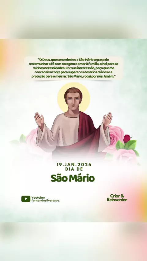 19 de janeiro de 2026 • Dia de São Mário. ✨ Hoje elevamos nossa oração pedindo a intercessão de São Mário, exemplo de fé, coragem e amor à família. Que sua proteção nos fortaleça para enfrentar os desafios diários com esperança e confiança em Deus. 🙏 Que neste dia especial possamos renovar nossa fé, buscar a força que vem do alto e confiar que, com oração e perseverança, jamais caminhamos sozinhos. São Mário, rogai por nós. Amém! 🌿 #SãoMário #Fé #Oração #ProteçãoDivina