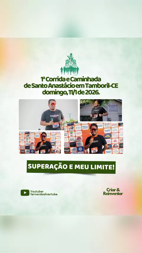 ๐Ÿƒโ€โ™‚๏ธโœจ 1ยช Corrida e Caminhada de Santo Anastรกcio โœจ๐Ÿƒโ€โ™€๏ธ Essas fotos registram um momento especial da 1ยช Corrida e Caminhada de Santo Anastรกcio, realizada no domingo, dia 11/1 de 2026, em Tamboril-CE. Um dia marcado por superaรงรฃo, fรฉ, alegria e muita felicidade por ter participado desse grande evento, vivido cada passo com gratidรฃo e emoรงรฃo. Que venham novos desafios e a alegria de sempre poder retornar, mais forte e confiante, porque superaรงรฃo รฉ o meu limite! ๐Ÿ’ช๐Ÿ”ฅ #Superaรงรฃo #Gratidรฃo