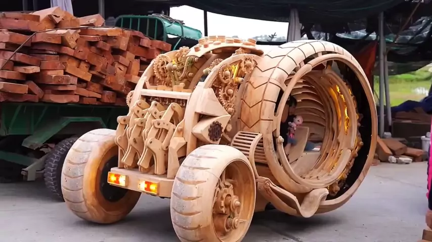 O menino construiu um carro de fantasia para seu filho de madeira, o que é incrível.