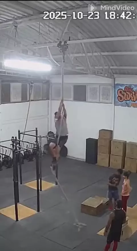 đŸ˜± HOMEM CAI FAZENDO CROSSFIT!! đŸ˜± ApĂłs subir na corda homem despenca, mas cai em segurança. amigos zoam ele 😅#crossfit#cctv#sora#ai